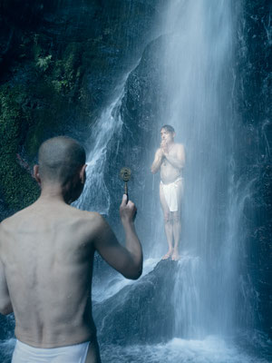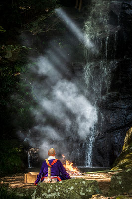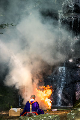 Bei einem dieser Wasserfälle gab es ein Saito Goma und der dichte Rauch stieg fast magisch durch die Lichter der aufsteigenden Sonnenstarhlen empor.