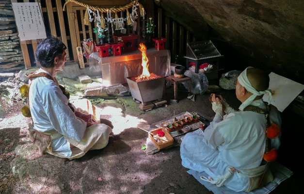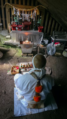 Am Abend des zweiten Tages erreichten wir den Gipfel und gedachten der vor 11 Jahren bei dem Vulkanausbruch des Ontake der verstorbenen Opfer. Mein Kontakt zu dieser Gruppe Chisho Sensei war einst Shingon Mönch am Koya san und dementsprechend viel hatte er mir zu diesem Thema zu erzählen. Ogane Sensei begeisterte mich mit seinen powervollen Ritualen und die Trancesituationen in die er sich immer wieder versetzte.