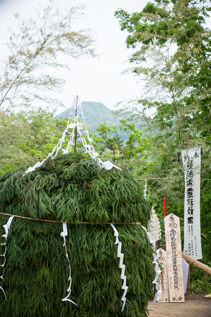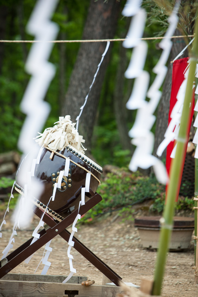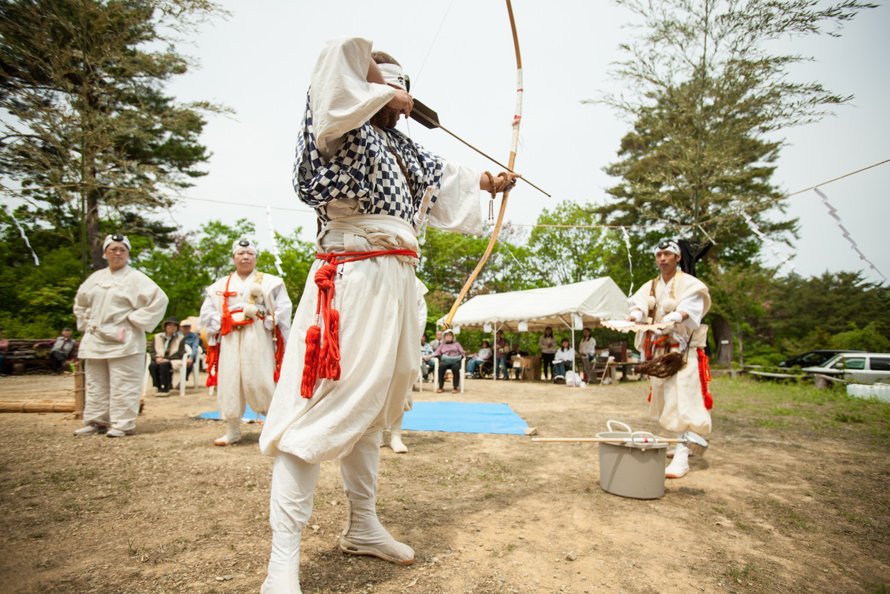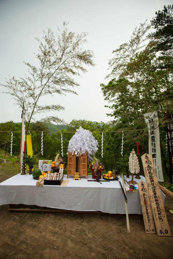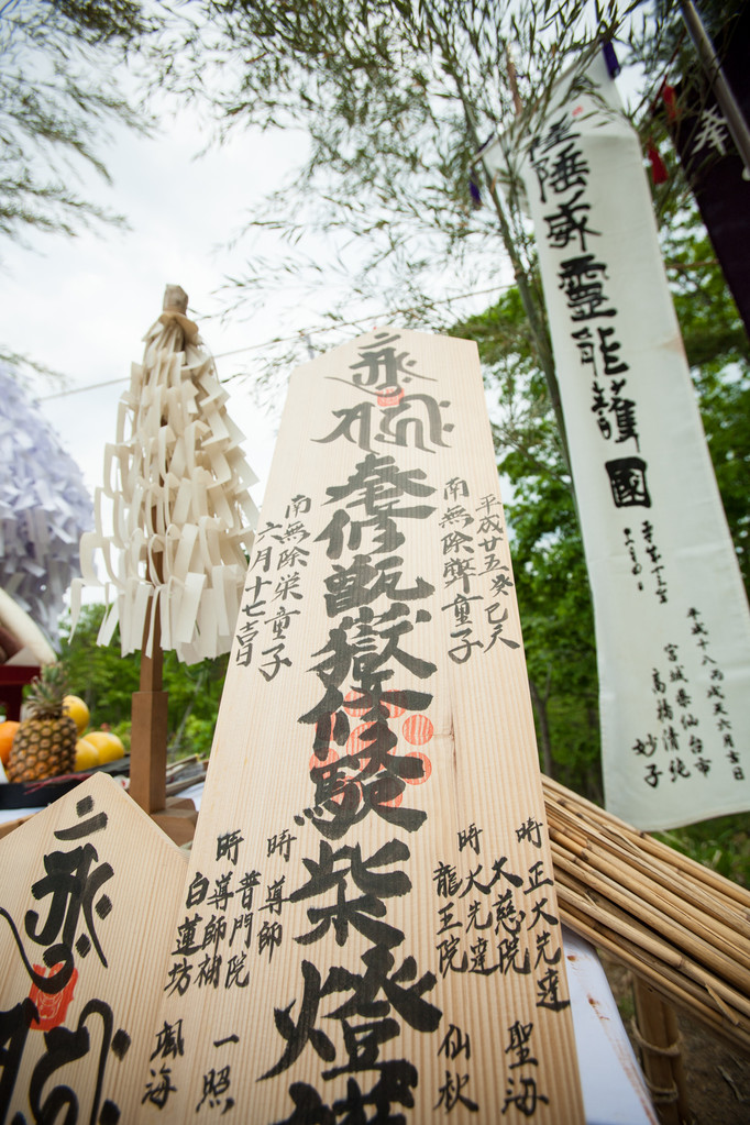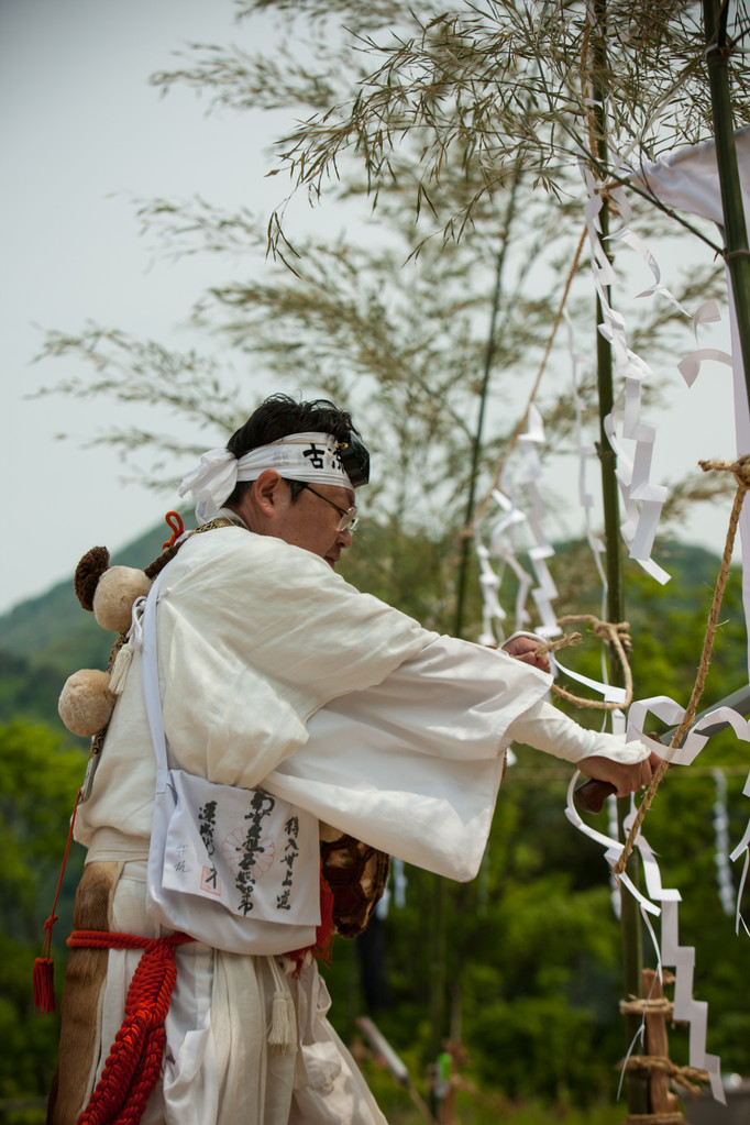 Zu Beginn der Zeremonie wird das Hanfseil das die Barriere bildet durchgeschnitten und die Yamabushi betreten die symbolische Matrixplattform. Das Horagai wird geblasen und einige Gebete und Mantra werden rezitiert.