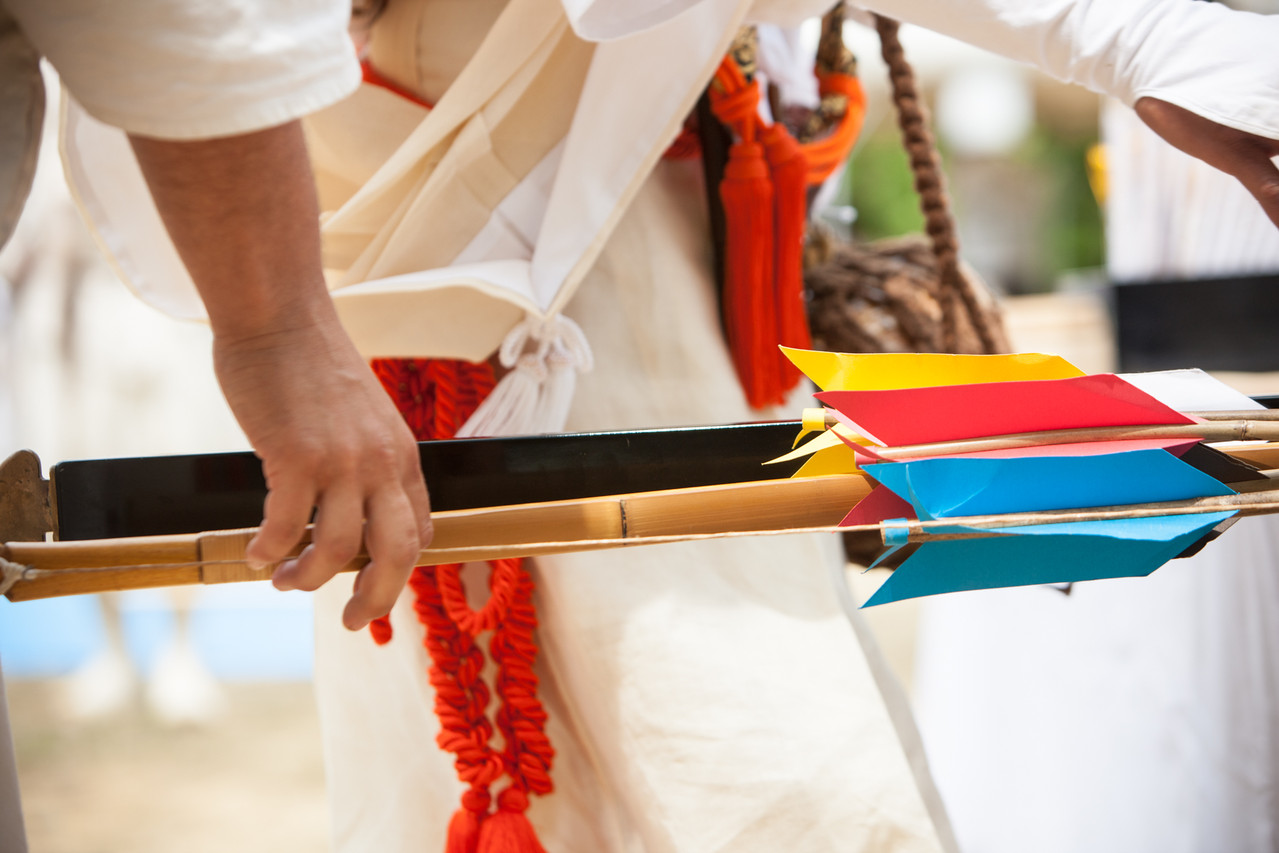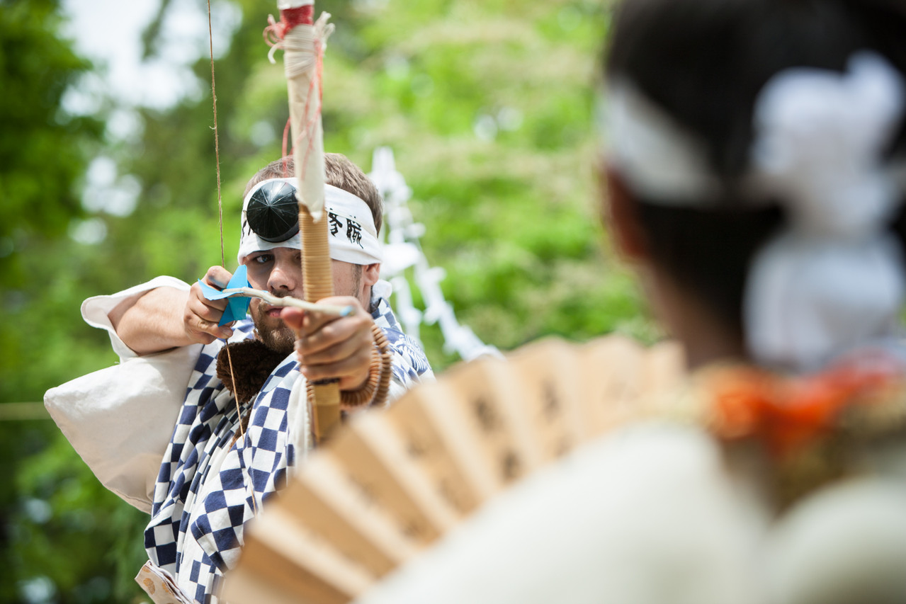 Dann gehen sie zur östlichen Ecke. Die Person mit dem Fächer stellt sich direkt in die Ecke, während die Person mit dem Bogen etwa vier Meter vor ihm Stellung bezieht. Die dritte Person mit den Pfeilen kniet sich hinter den Bogenschützen und gibt ihm den passenden (blauen) Pfeil. Der Bogenschütze setzt den Pfeil auf die Sehne und spricht: